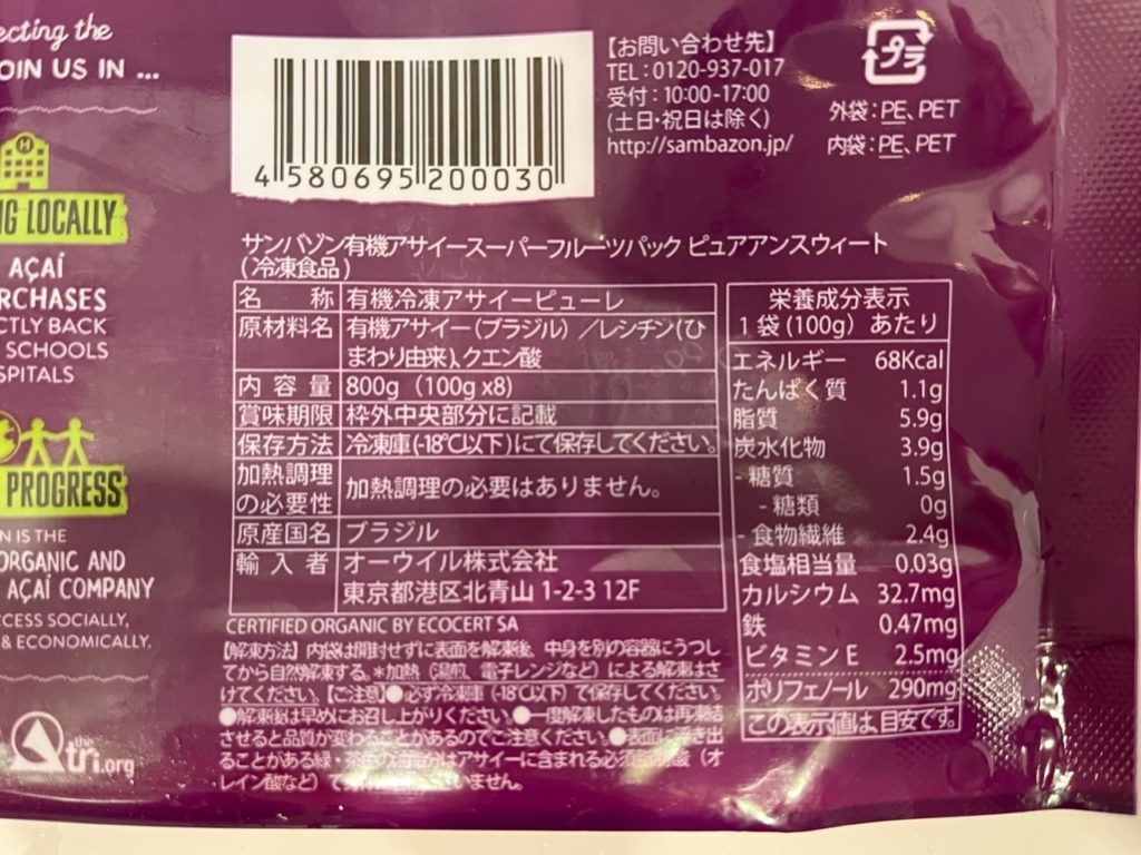 コストコで購入した「サンバゾン 有機アサイースーパーフルーツ ピュアアンスウィート 100g×8」について記載しました。