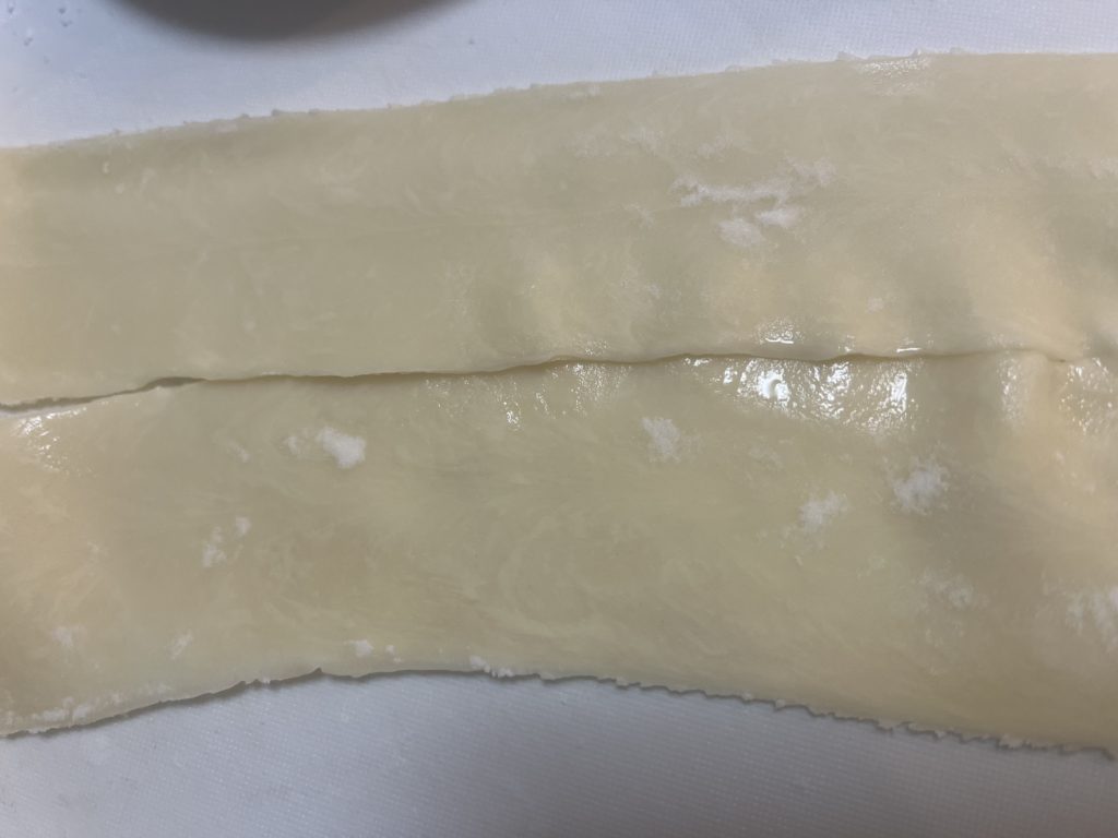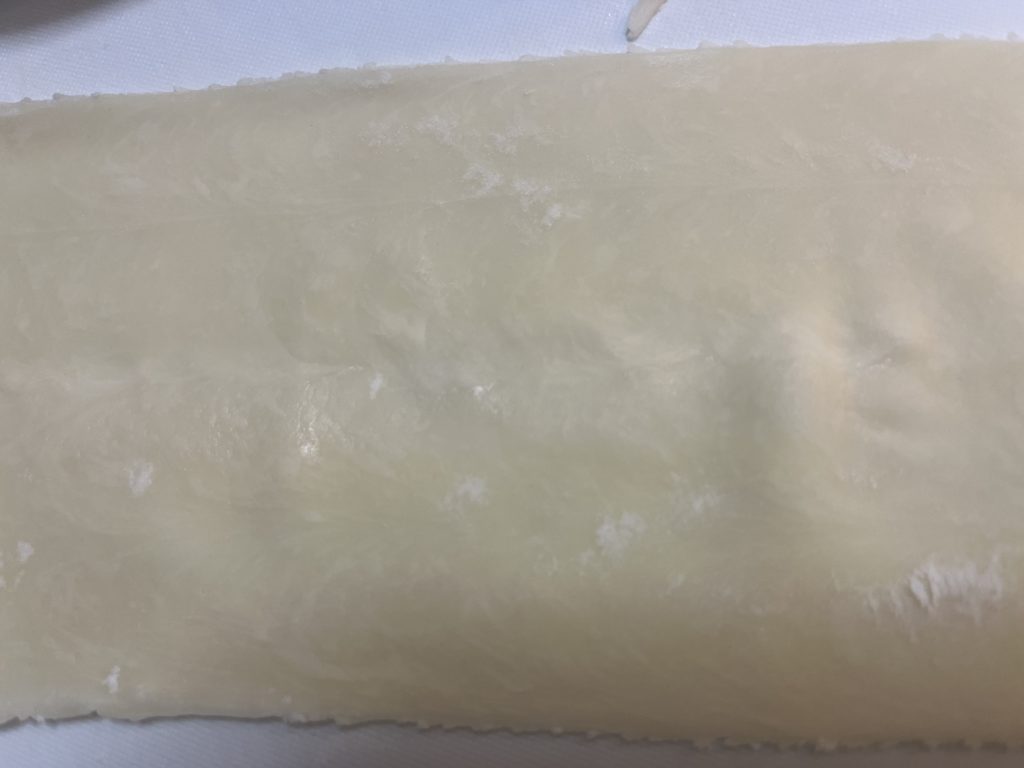 うにうにと皮が出てきたら、打粉の片栗粉を付けながらクルクル巻いていきます