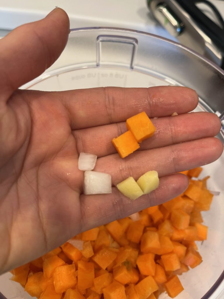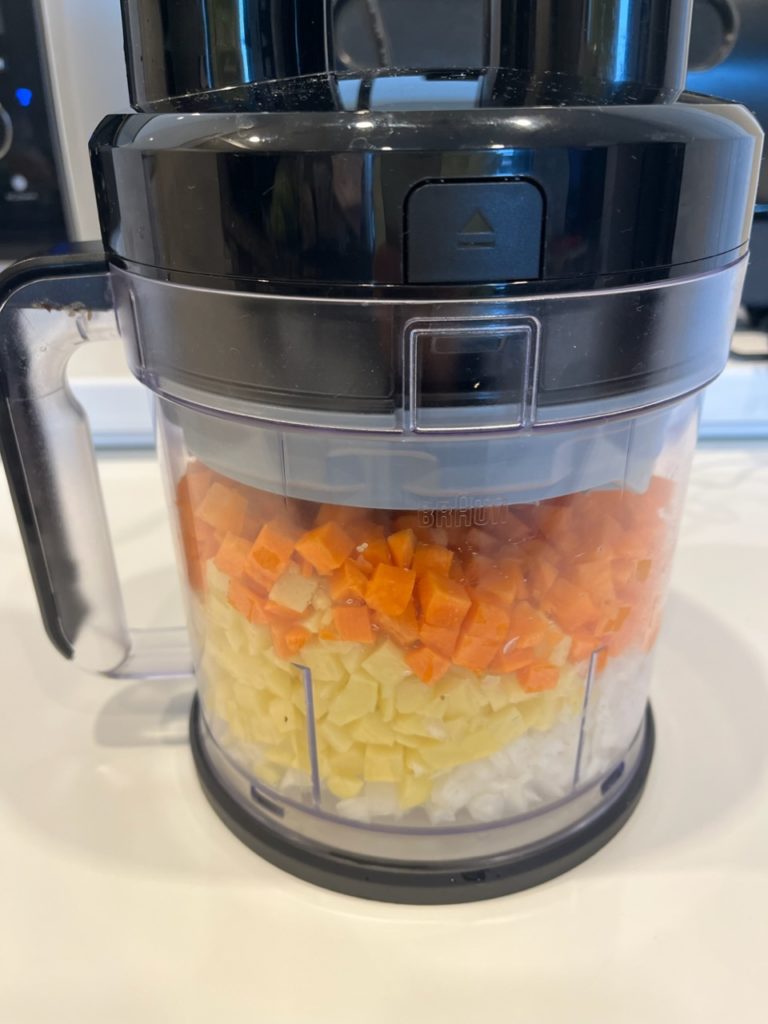 ※玉ねぎは端がカットしにくいため、初めに玉ねぎ→後にニンジン等をカットすると玉ねぎが次に来る野菜に押されて上手くカットできます